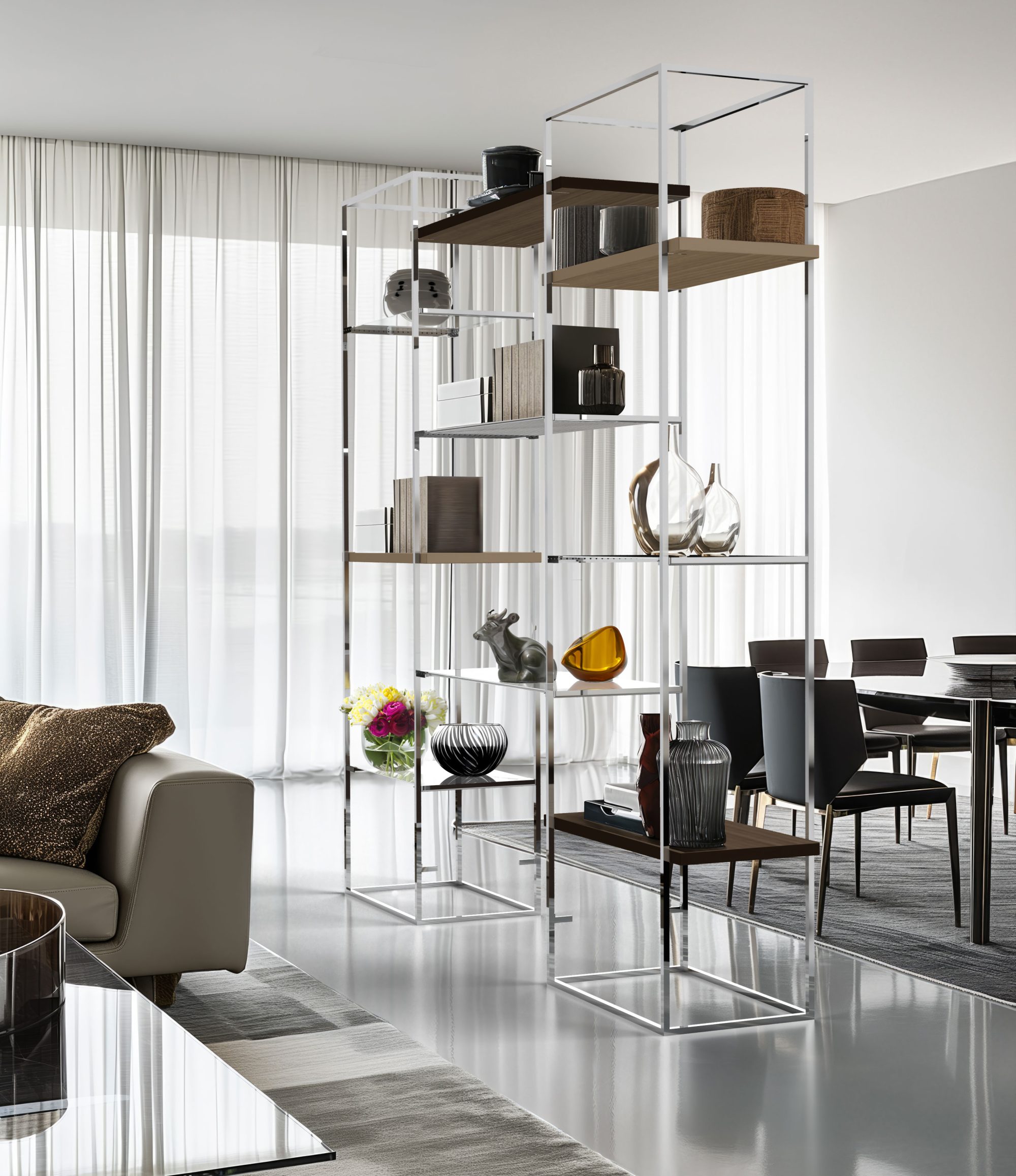 – ripiani disponibili in: metallo black aubergine con vetro trasparente, legno rovere naturale e legno rovere wenge.