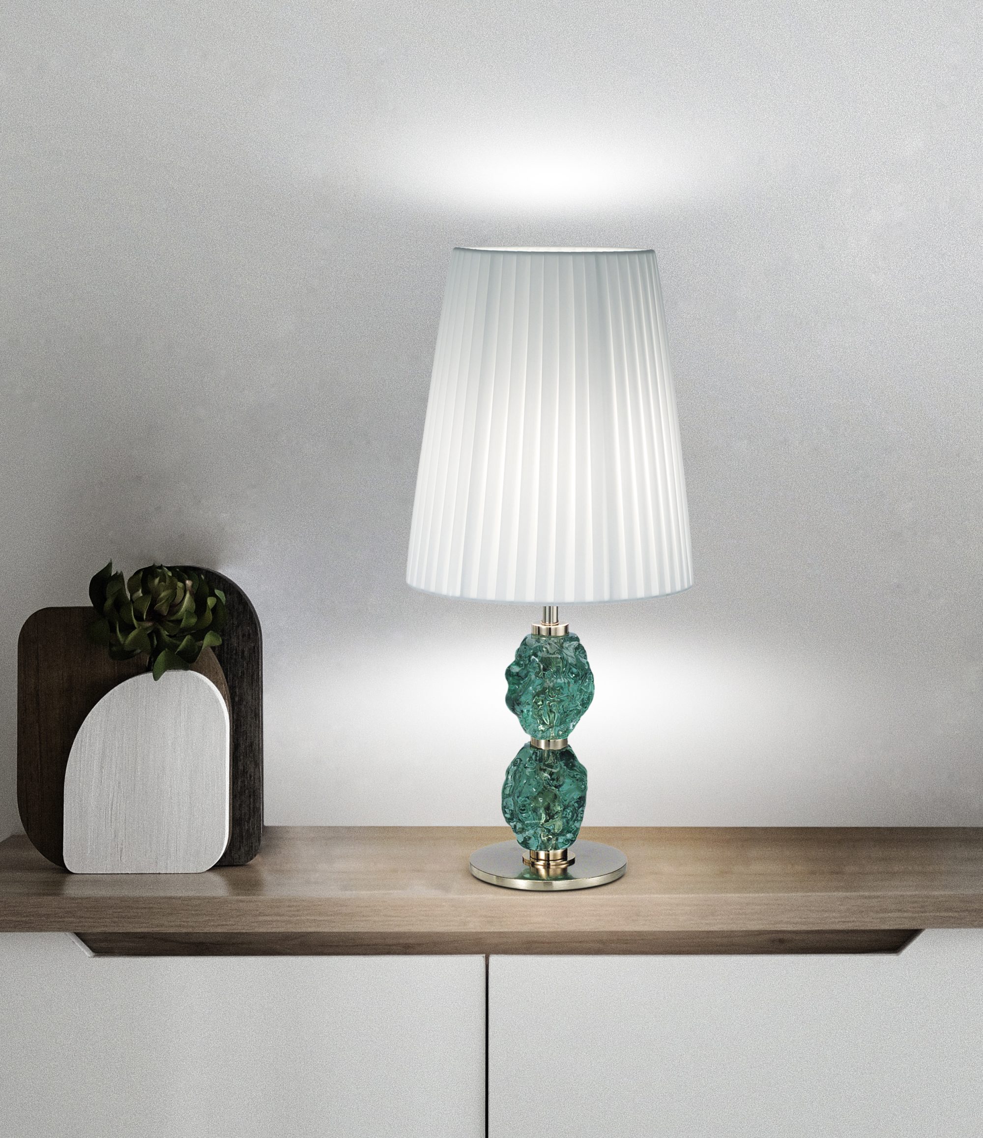 Una collezione dalle linee armoniose che richiama la raffinatezza degli anni ’60. La personalizzazione dei colori dei paralumi e del vetro impreziosiscono ogni creazione.