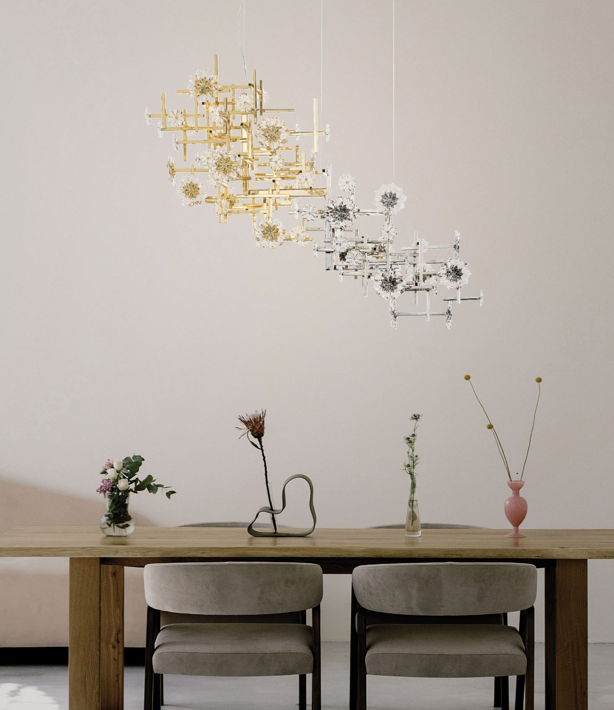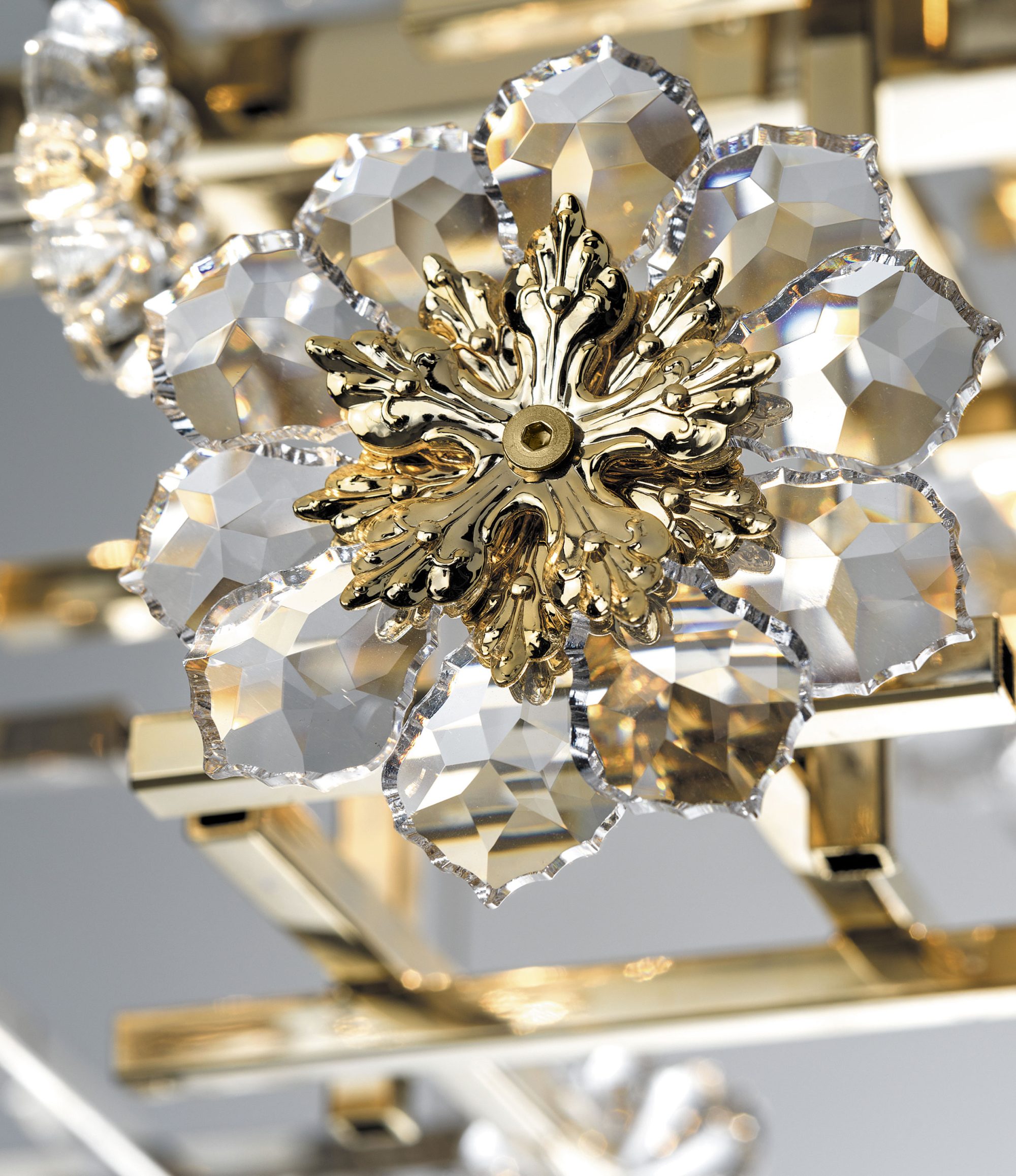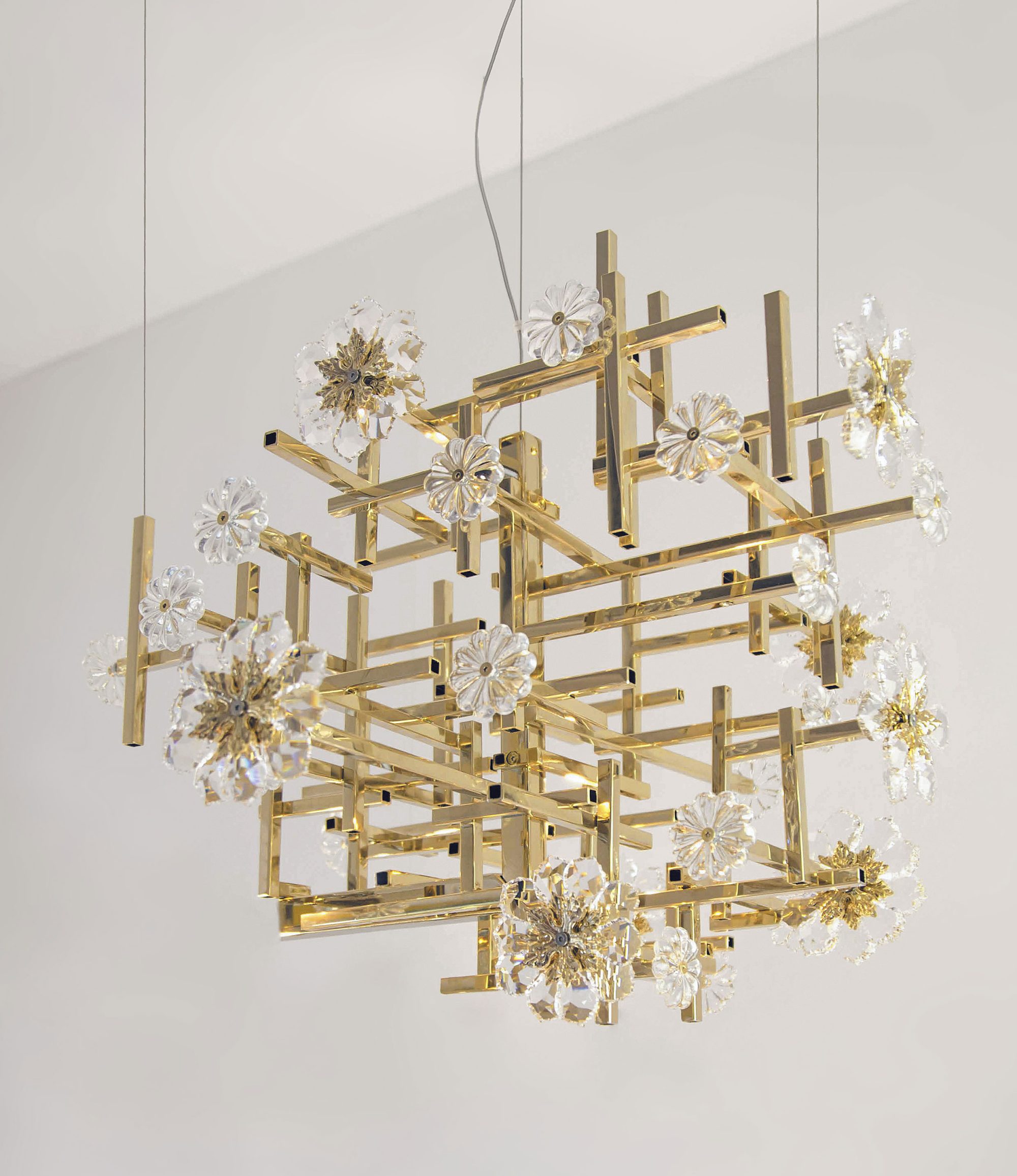 La natura si unisce alla sofisticatezza di geometrie angolari in questa collezione, caratterizzata da preziosi fiori in cristallo.