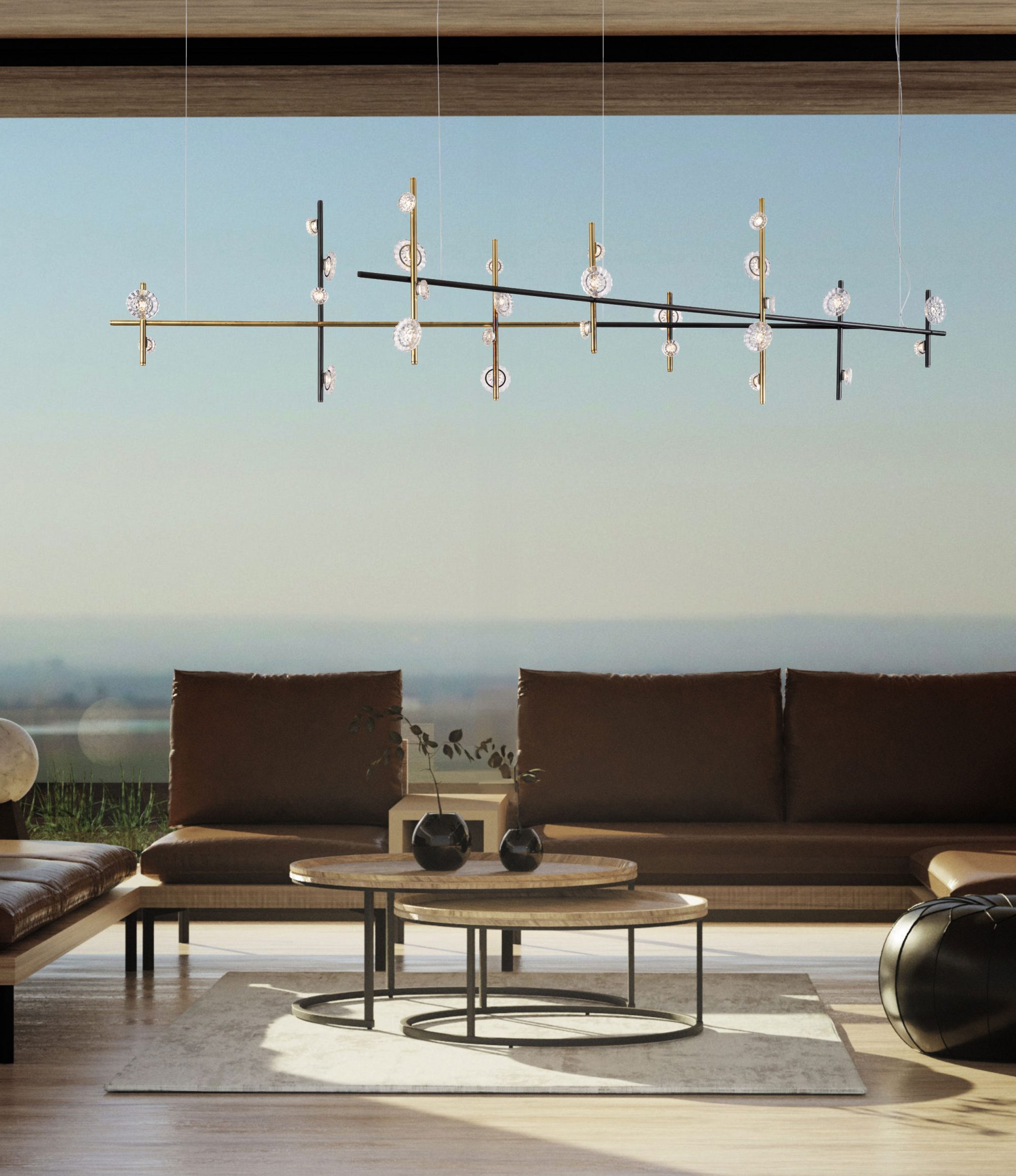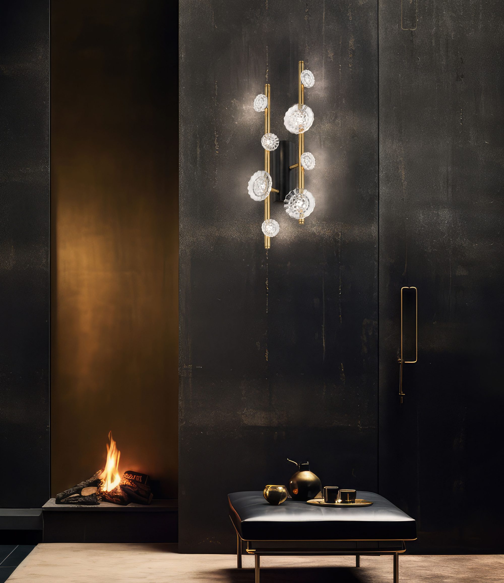 Una collezione di minimalismo decorativo e di grande fascino, dove fiori in vetro di Murano donano lucentezza a segmenti lineari.