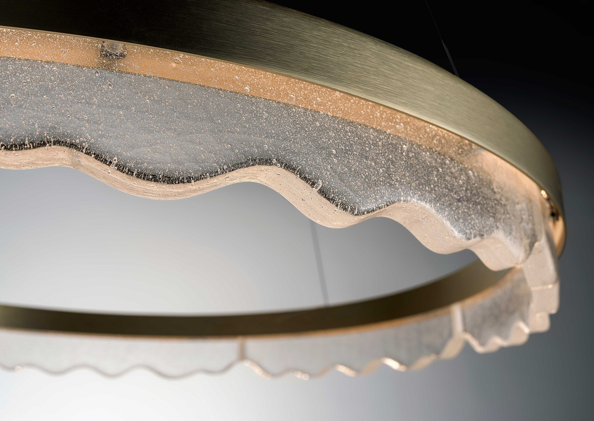 I materiali usati per la produzione sono il vetro di Murano trasparente Pulegoso e metallo con nuove finiture verniciate e galvaniche che riflettono la luce con brillantezza.